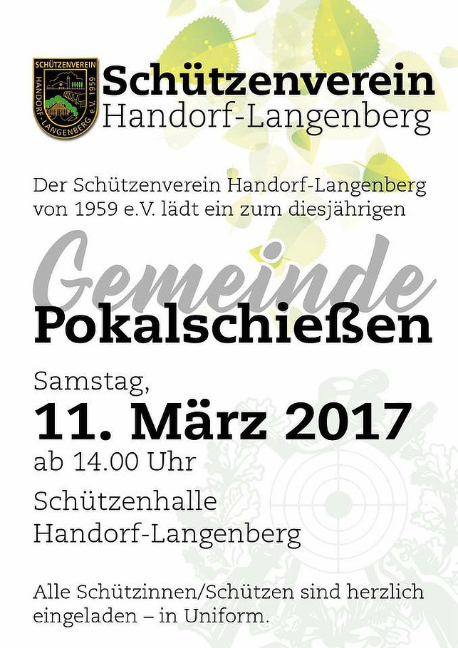 Eine Woche nach dem morgigen Preisschießen und Knobeln findet am 11.03.2017 ab 14 Uhr das Gemeindepokalschießen der Schützenvereine Holdorf, Fladderlohausen und Handorf-Langenberg in der Schützenhalle Handorf-Langenberg statt!